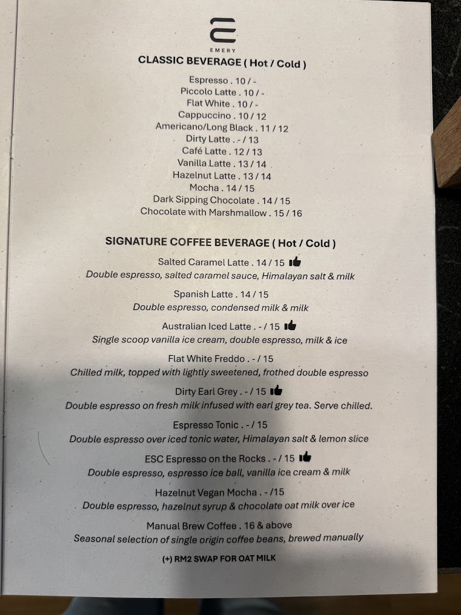 Welcome to Emery Coffee by ESC, a hidden gem nestled in the heart of Putra Heights. Located next to the Kumon Tuition Centre, this charming café captures the essence of community dining, making it a perfect spot for family gatherings. Renowned for its rich, 100% Arabica coffee blends sourced from regions like Ethiopia and Colombia, patrons rave about the exceptional coffee craftsmanship that brings a delightful aroma and flavor to every cup.